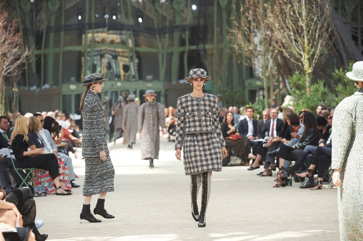 巴黎当地时间7月4日,CHANEL在老地方巴黎大皇宫发,2017/18高级定制服系列。老佛爷卡尔·拉格斐这次送走了巨型火箭,把38米高的巴黎铁塔搬进了秀场里,把巴黎大皇宫变成了城市公园,营造出巴黎城市的惬意氛围。